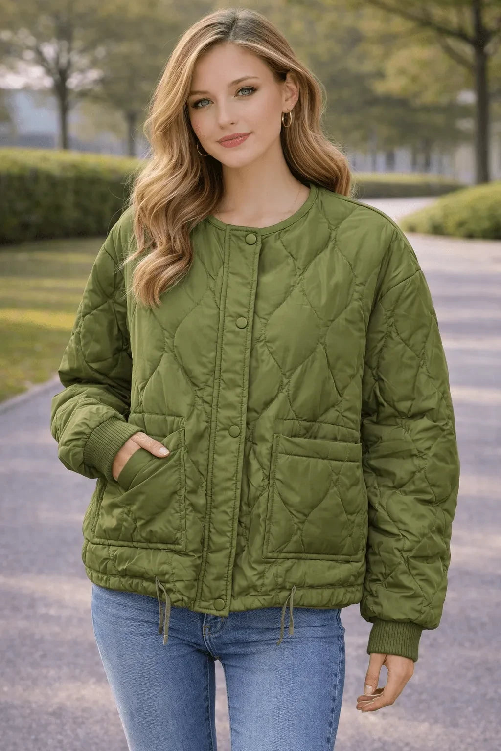 A womenโs quilted jacket with a practical and modern design, featuring a trendy olive green color perfect for fall and winter. The jacket is lightly padded to provide warmth without heaviness and designed with diamond quilting for a stylish look. It includes functional side pockets and an easy front closure, making it comfortable for daily wear and casual outings.