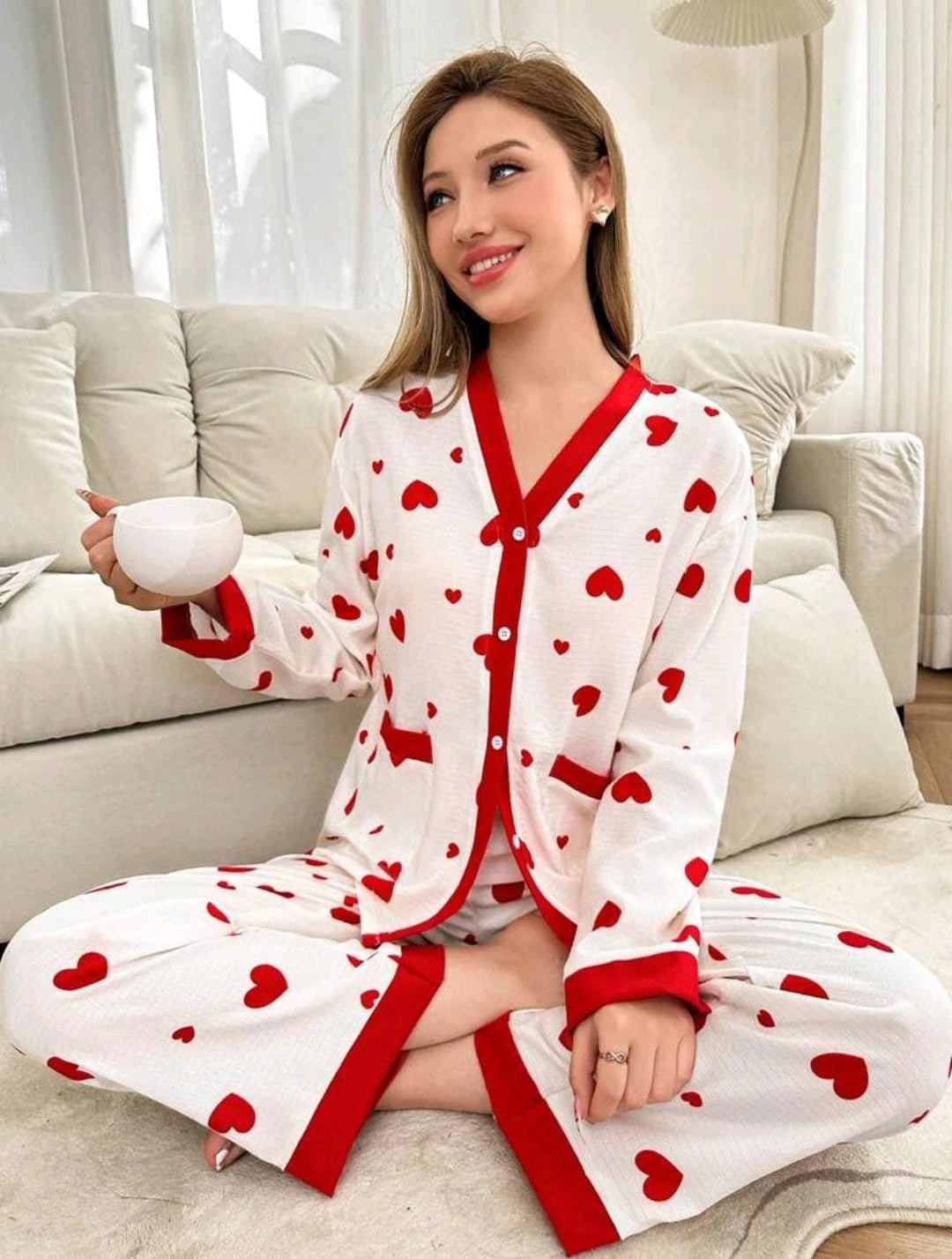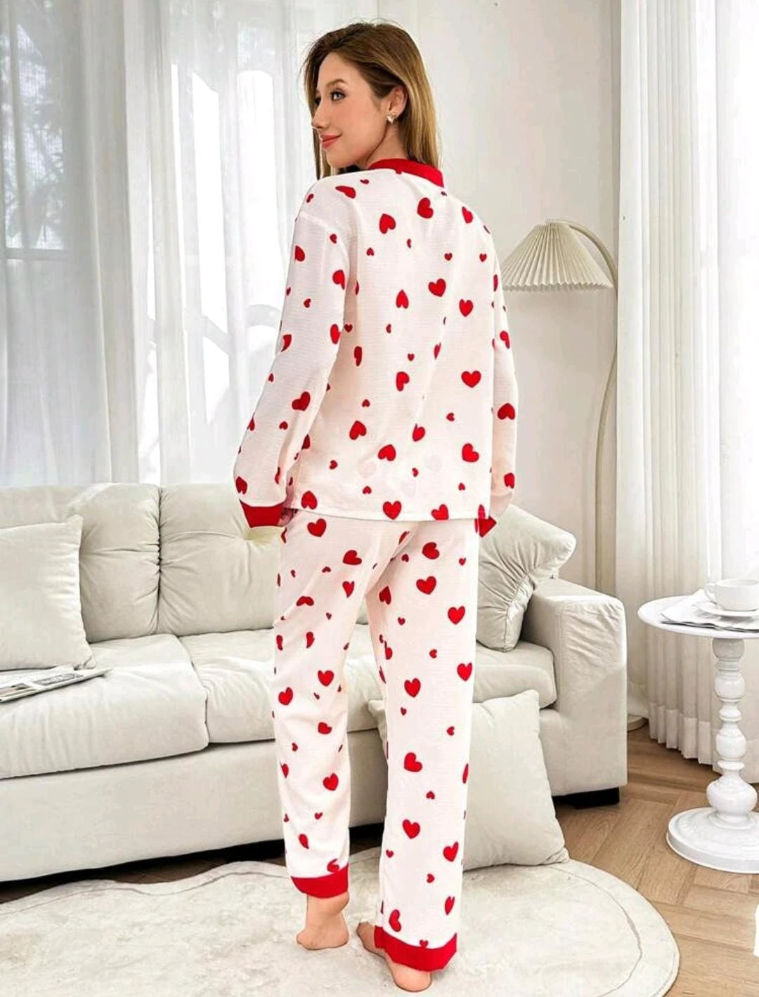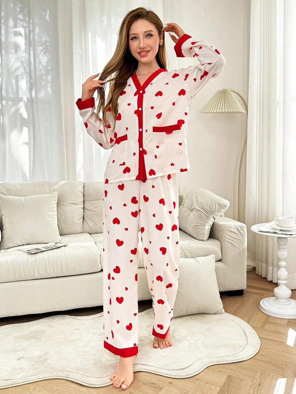 طقم بيجاما قطني نسائي من قطعتين: بلوزة بأكمام طويلة وأزرار أمامية مع حواف حمراء وفتحة رقبة على شكل حرف V، مع بنطال طويل مطابق مطبوع عليه قلوب.