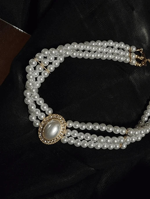 قلادة تشوكر من اللؤلؤ بثلاث طبقات مع قطعة مركزية بيضاوية - تصميم كلاسيكي أنيق
