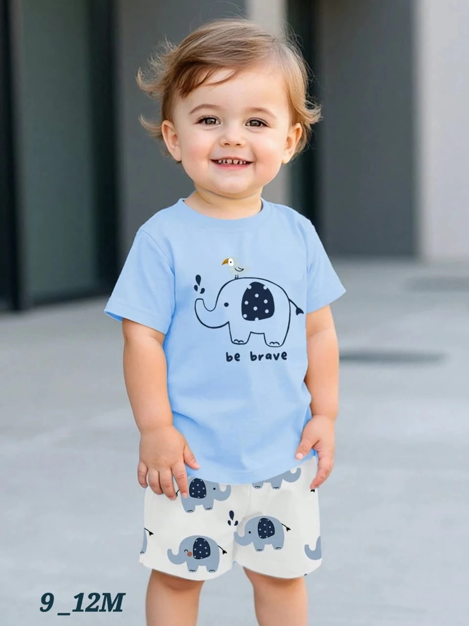 طقم تيشيرت وشورت صيفي للأولاد الصغار - بطبعة فيل لطيفة - قطن ناعم