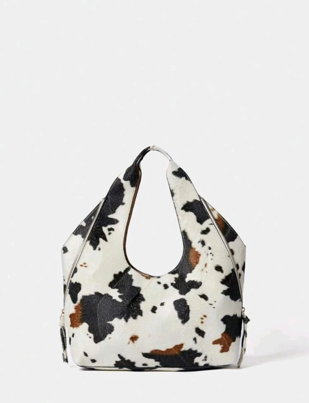 تُعدّ هذه الحقيبة الكتفية الفريدة قطعةً مميزةً في عالم الموضة. تتميز بنقشة جلد البقر الجذابة باللون الأبيض والأسود والبني على جلد صناعي ناعم، مما يضفي لمسةً فنيةً وجريئةً على إطلالتك. تصميم المقبض المنحني المدمج يمنحها مظهراً فنياً أنيقاً، مثالياً لعاشقات الموضة اللواتي يُحببن التميز.