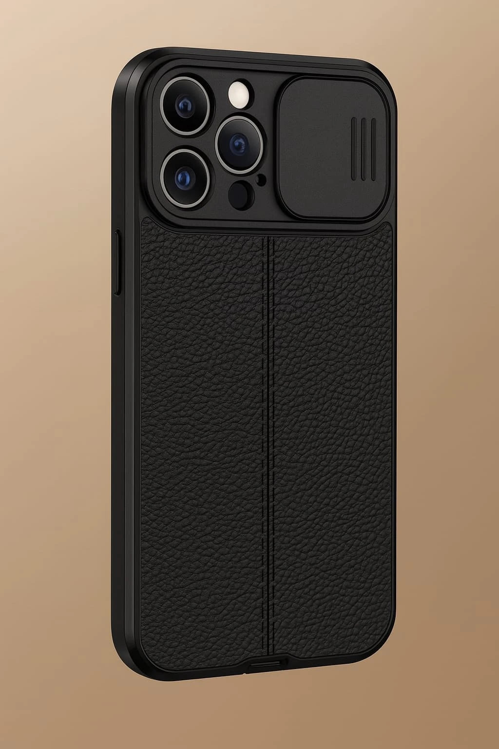 جراب هاتف فاخر مصنوع من الجلد الصناعي، بلمسة نهائية سوداء أنيقة وتصميم عصري وبسيط. يتميز بغطاء كاميرا منزلق لحماية العدسة وضمان الخصوصية. الغطاء مقاوم للصدمات، وسهل التركيب، ويوفر تغطية كاملة لحماية هاتفك من التلف الناتج عن الاستخدام اليومي.