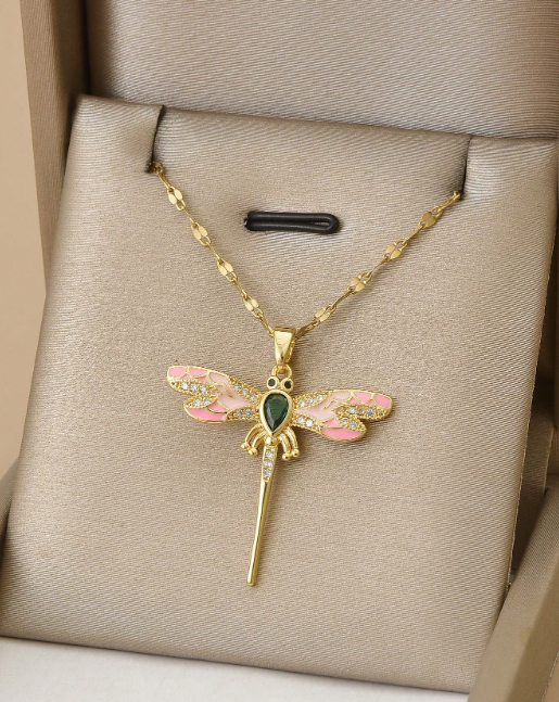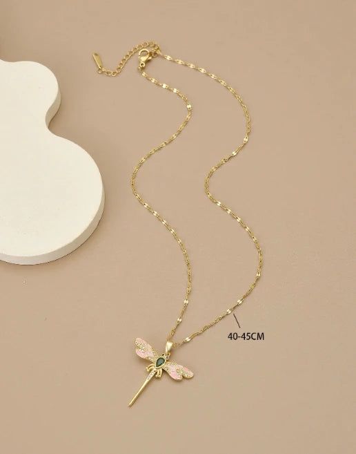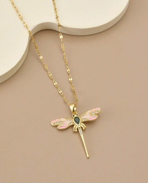 قلادة فراشة ذهبية - أجنحة وردية وحجر كريم أخضر