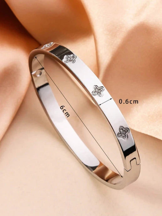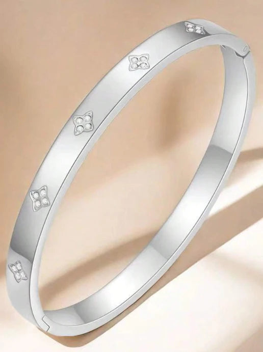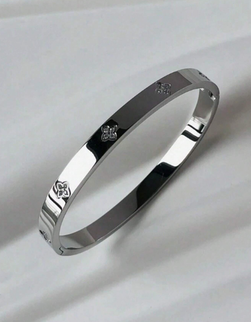 سوار فضي أنيق ولامع، يتميز بنقوش محفورة بدقة ولمسات رقيقة من الكريستالات الصغيرة. تصميمه البسيط والعملي يجعله مثالياً للارتداء اليومي أو لارتدائه مع أساور أخرى لإطلالة عصرية أنيقة.