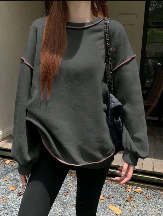 هذا السويت شيرت الواسع بلونه الرمادي الداكن الغني يتميز بتصميم بسيط وأنيق، مع لمسة أنثوية رقيقة بفضل حوافه الوردية الناعمة. مصنوع من قماش قطني ناعم لطيف على البشرة، بأكمام واسعة توفر حرية الحركة وراحة طوال اليوم.