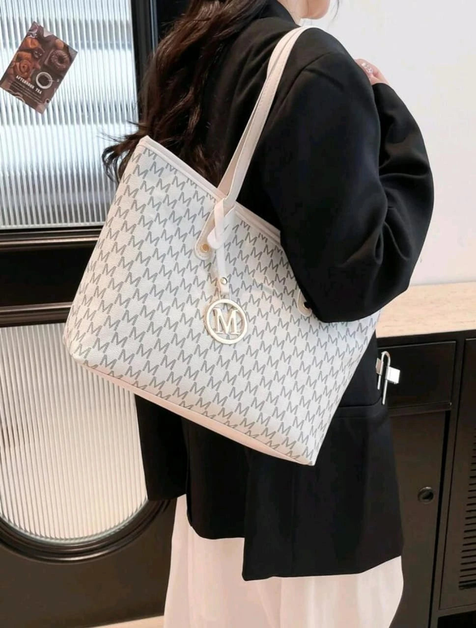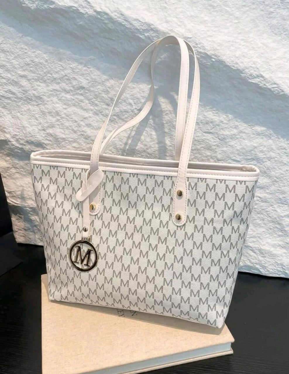 تتميز هذه الحقيبة الأنيقة بنقشة حرف "M" المميزة على جلد صناعي أبيض ناعم، مما يمنحها مظهرًا أنيقًا يناسب الاستخدام اليومي. تتضمن الحقيبة مقابض طويلة مريحة وزينة معدنية أنيقة تضفي عليها لمسة تصميمية مميزة. تصميمها المستطيل الواسع يجعلها مثالية للعمل أو الدراسة أو حتى للخروجات غير الرسمية، لتمنحك إطلالة راقية.