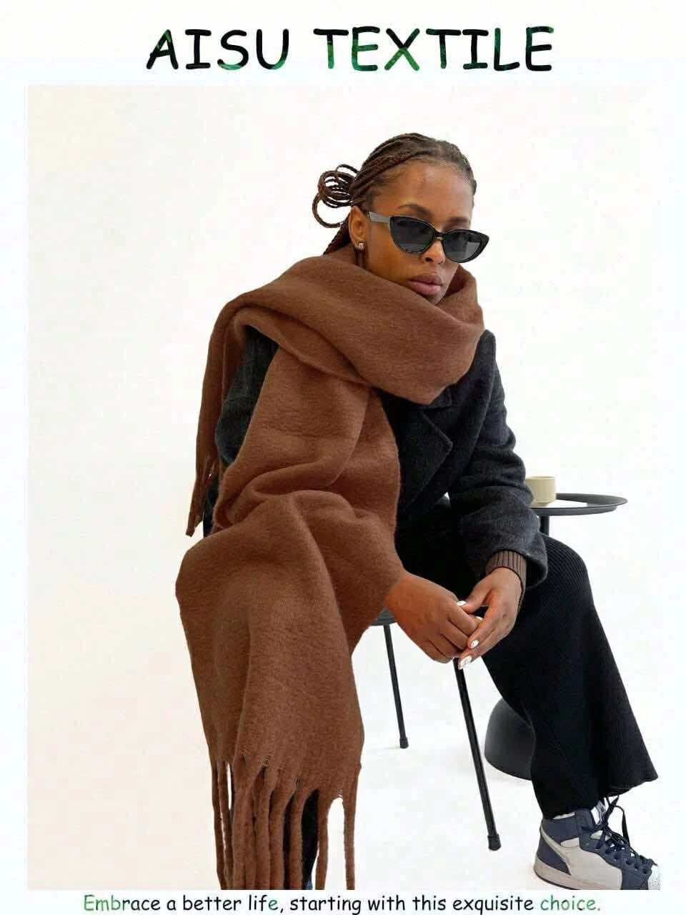 وشاح شتوي طويل مصنوع من قماش صوف ناعم بلون بني غني. يتميز بطوله الكبير الذي يوفر دفئًا إضافيًا، وحوافه المزينة بشرابات أنيقة، مما يجعله مثاليًا لارتدائه فوق ملابس الشتاء وإضافة لمسة دافئة وأنيقة.