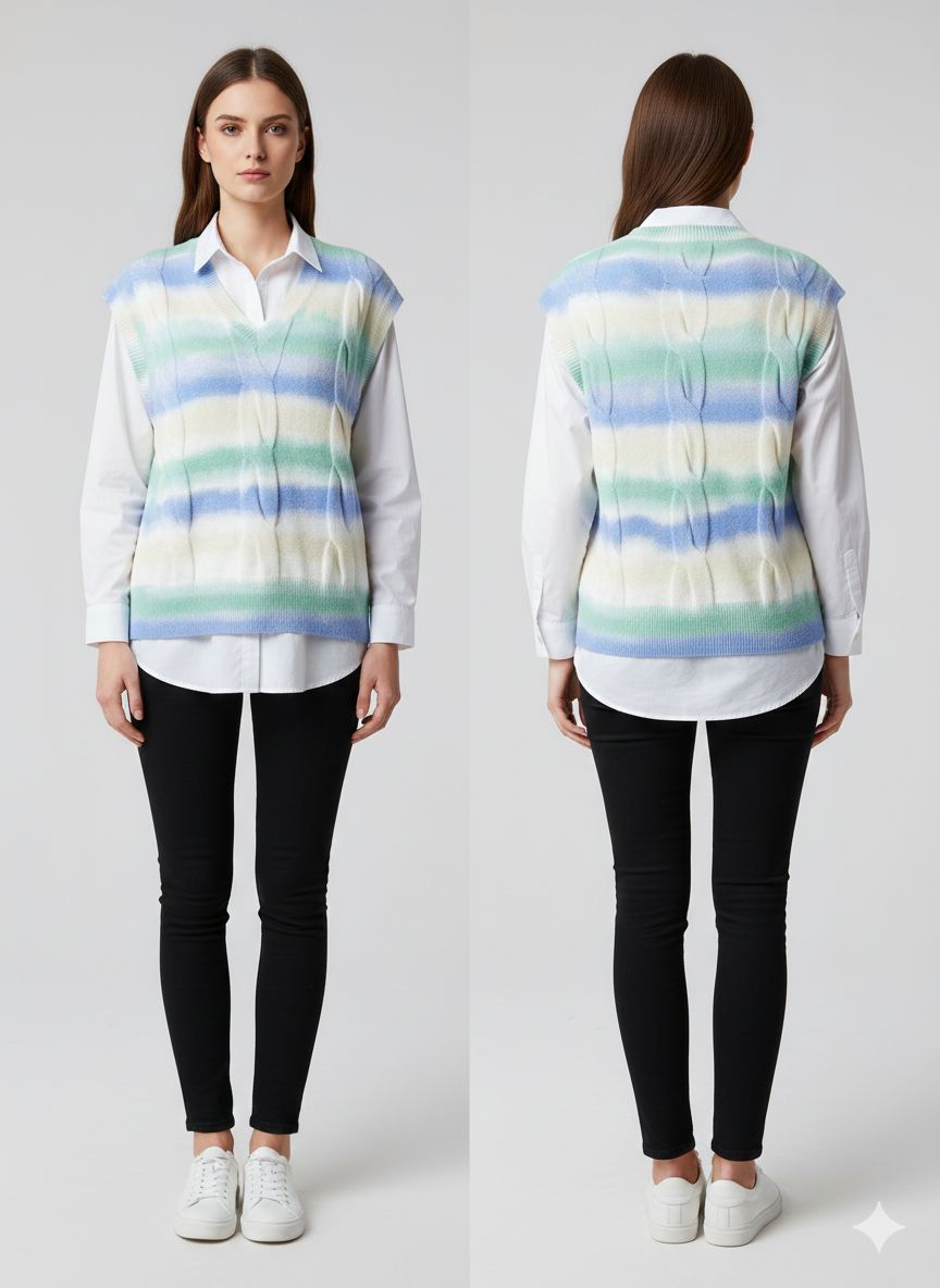 يتميز هذا الصدرية النسائية المحبوكة بدون أكمام بتصميم مخطط متدرج ناعم يضفي لمسة عصرية وأنثوية على إطلالاتك اليومية. مصنوع من قماش محبوك خفيف الوزن يسمح بمرور الهواء، مما يجعله مريحًا للارتداء طوال اليوم ومثاليًا لارتدائه فوق القمصان أو البلوزات.